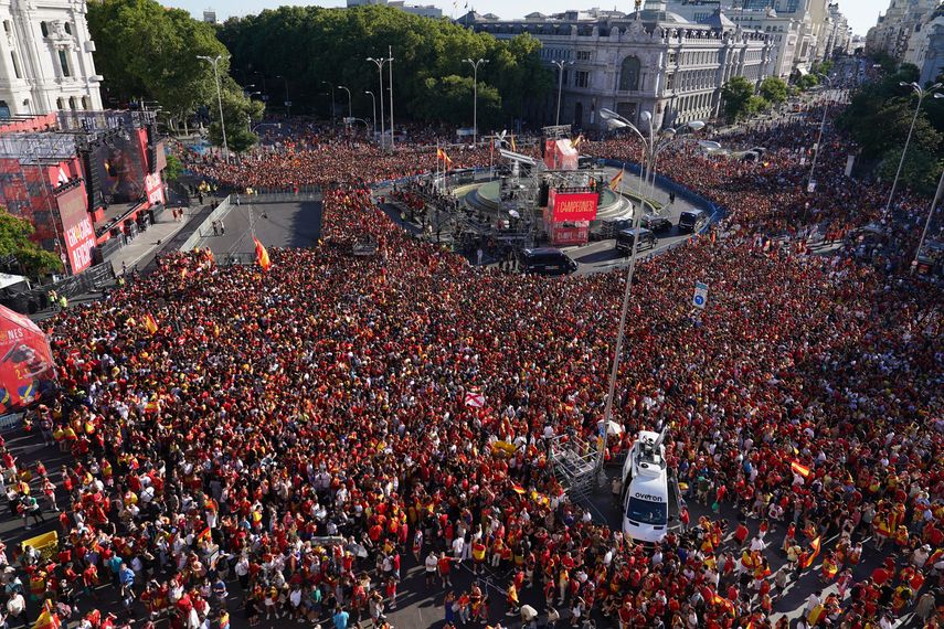 La selección española de fútbol recorrió este lunes unas calles de Madrid abarrotadas de aficionados que quisieron rendir homenaje a los campeones de la Eurocopa tras su victoria ante Inglaterra en la final (2-1).