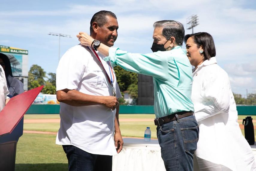 En un acto en el campo central del estadio, el presidente condecoró con la medalla de oro “Mariano Rivera” y entregó pergamino de honor al destacado pelotero Elpidio Pinto, quien agradeció la distinción del Gobierno Nacional.