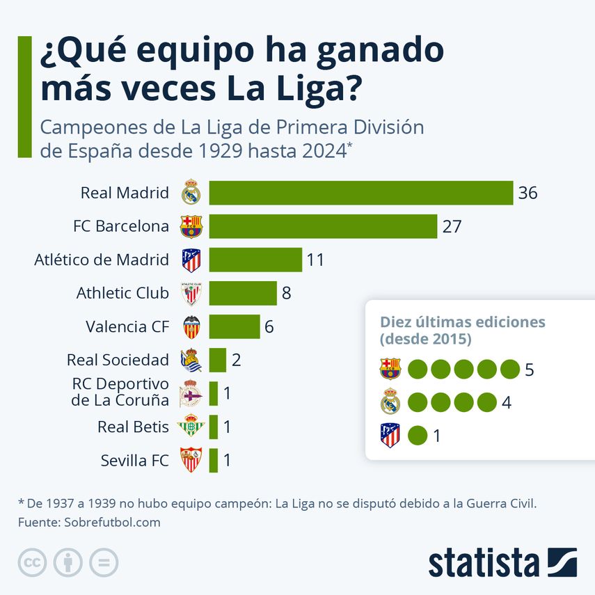 Datos de Sobrefutbol.com, indican que en las últimas diez ediciones de LaLiga, el máximo ganador fue el Barcelona. El Real Madrid es segundo con cuatro triunfos y el Atlético Madrid es tercero con una victoria.