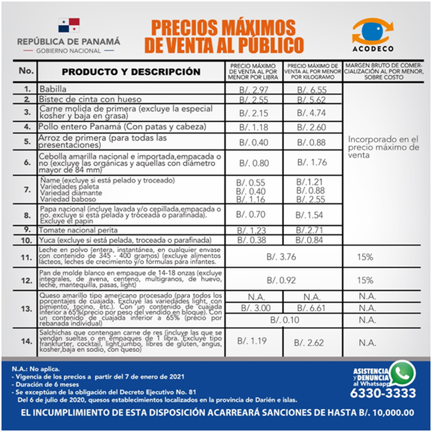 La Acodeco advierte a los agentes económicos que esta institución se mantiene vigilante en todo el país, para garantizar el cumplimiento del control de precios. Igualmente se hace un llamado a los consumidores, para que denuncien a los que vendan por encima de los precios establecidos para los 14 productos, reportando el nombre y ubicación exacta del local comercial a Sindi que funciona las 24 horas los 7 días de la semana, mediante el WhatsApp y Telegram al 6330-3333, las cuentas de las redes sociales AcodecoPma en Facebook, Twitter y la página web de esta institución.