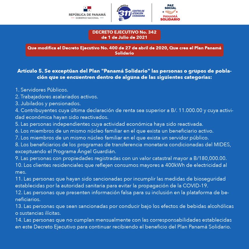 Conoce las exclusiones establecidas en el Decreto Ejecutivo 342 de 1 de julio de 2021, que modifica el Decreto 400 de 27 de abril de 2020, que crea el Plan Panamá Solidario: