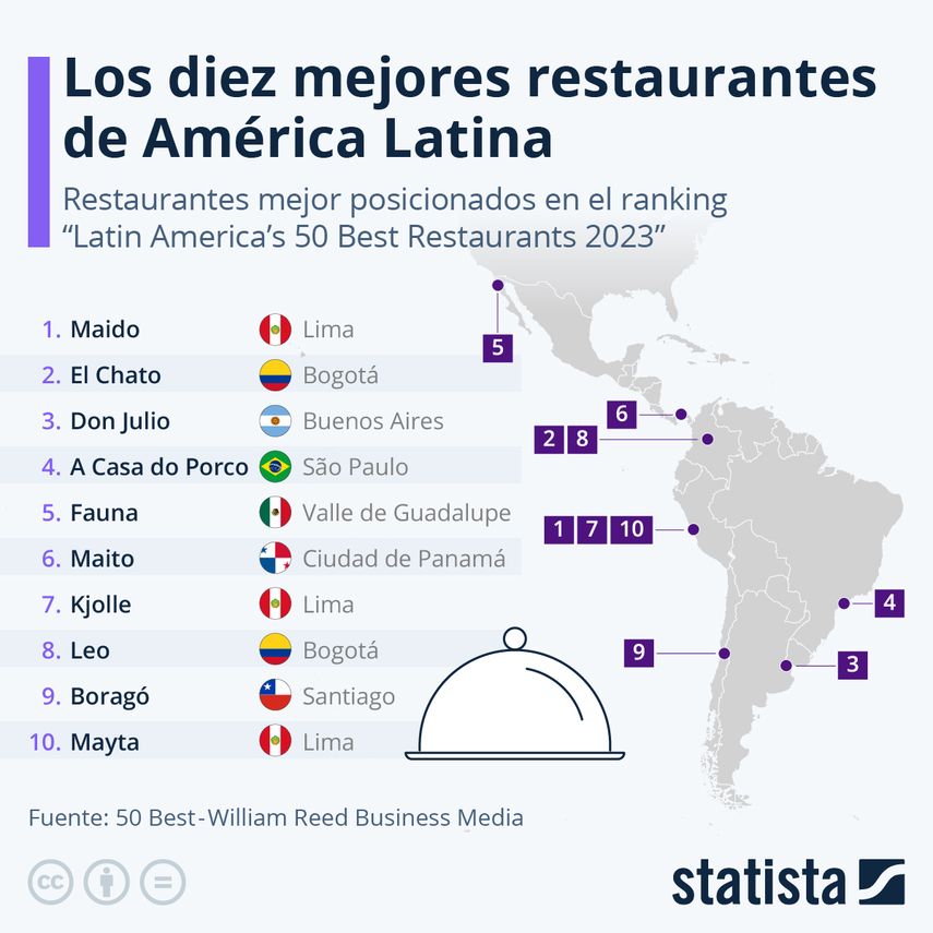 Como vemos en el gráfico compartido por Statista, en el top 10 también hay sitio para otros dos establecimientos peruanos, ambos en Lima: Kjolle, en la séptima posición, y Mayta, en la décima.