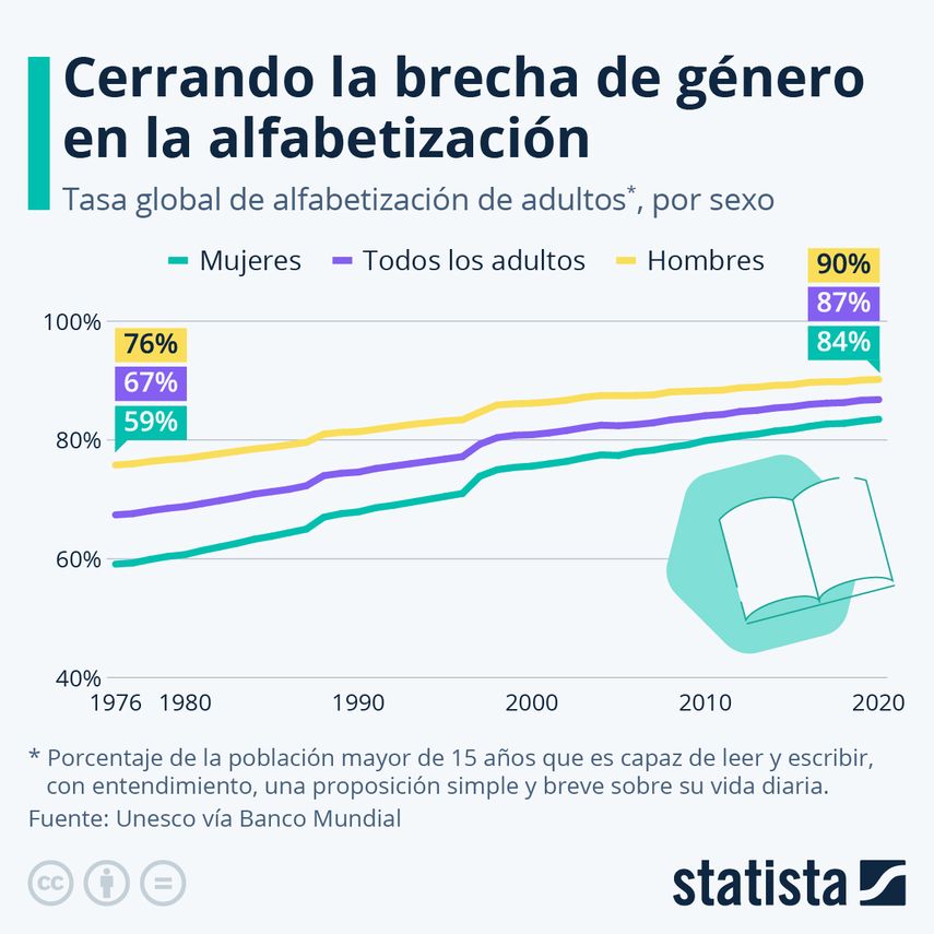 Aunque se trata de una enorme mejora en comparación con las tasas de alfabetización de adultos del 59% (mujeres) y el 76% (hombres) en 1976, la brecha del 6% sigue equivaliendo a 175 millones de mujeres que carecen de una habilidad tan esencial que se considera un derecho humano.