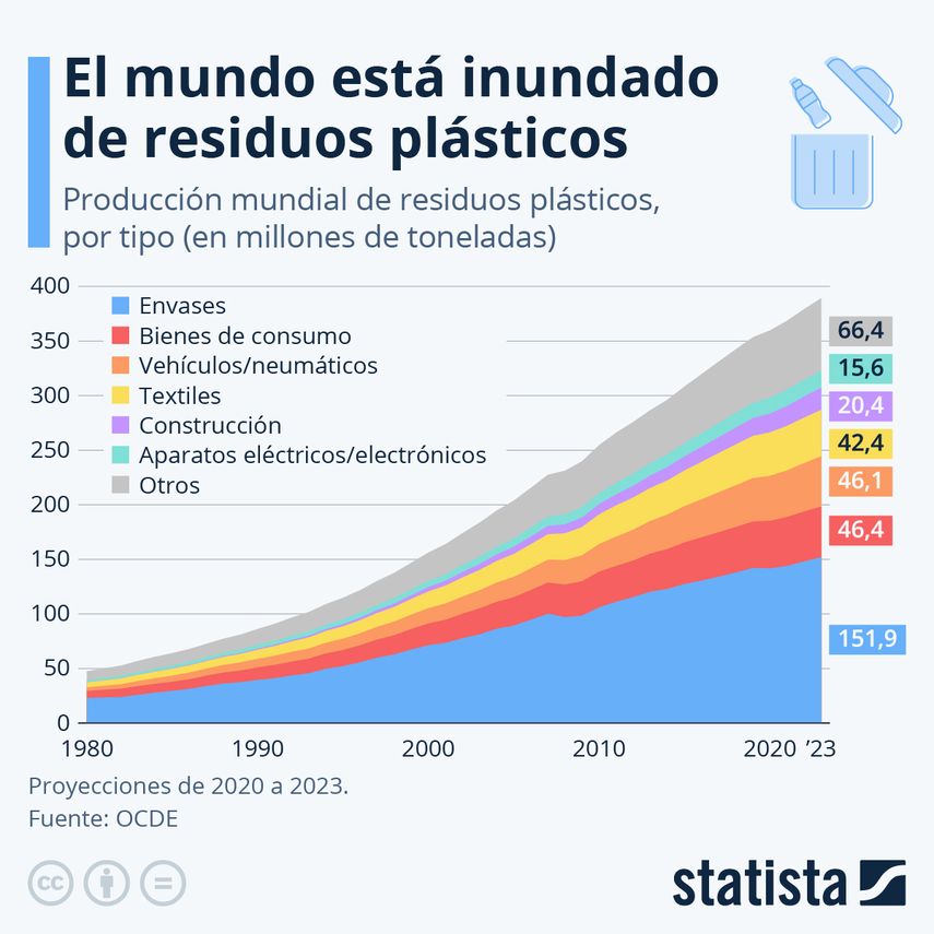 Las organizaciones internacionales no gubernamentales pro ambiente se mantienen en alerta y pie de lucha por la amenaza y la contaminación que representa para el mundo el crecimiento acelerado de residuos plásticos. En sólo dos décadas, la producción anual de residuos plásticos en todo el mundo se ha duplicado, pasando de 180 millones a más de 350 millones de toneladas. Estos datos tan preocupantes fueron difundidas esta semana en un informe de Perspectivas Mundiales del Plástico de la La Organización para la Cooperación y el Desarrollo Económicos (OCDE) y al cual tuvimos acceso a través del portal de Statista.