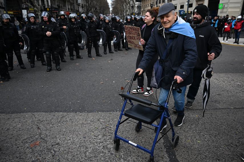 Cuando llega la policía a enfrentar al grupo de jubilados que protesta cada miércoles en Buenos Aires, la desproporción de fuerzas es evidente. Sobre todo porque muchos de los manifestantes necesitan ayuda para mantener el equilibrio.