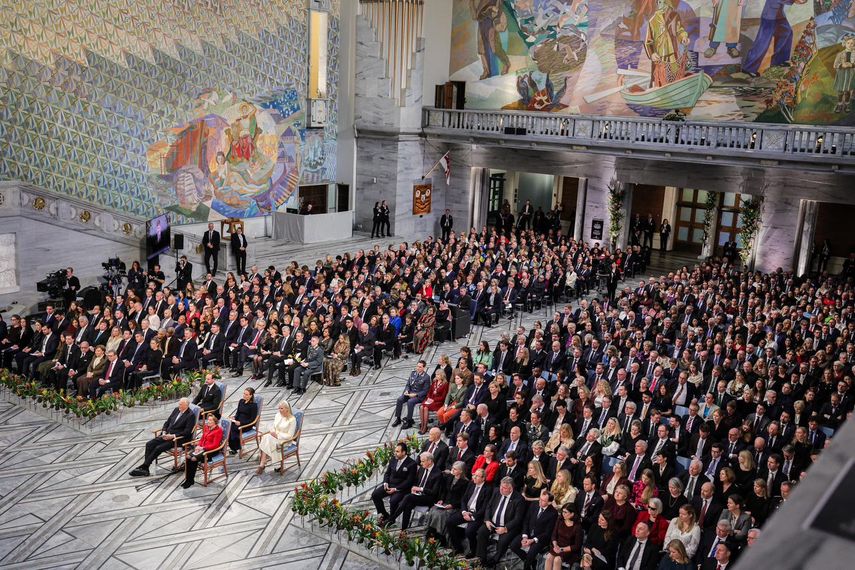 La ceremonia estuvo presidida por los reyes Harald y Sonia de Noruega, en presencia de tres presidentes latinoamericanos invitados por Machado: José Raúl Mulino (Panamá), Javier Milei (Argentina) y Santiago Peña (Paraguay).