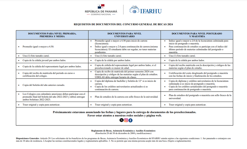 El Instituto para la Formación y Aprovechamiento de los Recursos Humanos (IFARHU) publicó hoy el calendario de recepción de documentos dirigido a los estudiantes de primaria, premedia y media, que fueron preseleccionados del Concurso General de Becas 2024.