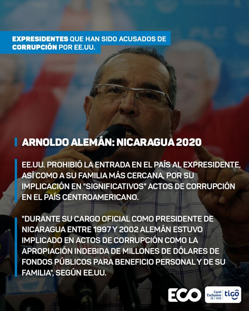 "Durante su cargo oficial como presidente de Nicaragua entre 1997 y 2002 Alemán estuvo implicado en actos de corrupción como la apropiación indebida de millones de dólares de fondos públicos para beneficio personal y de su familia", según EE.UU.