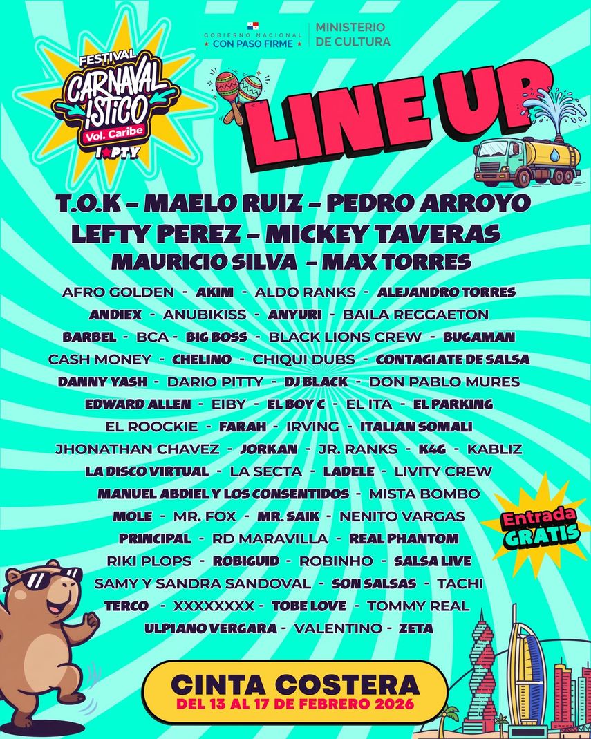 El Festival Carnavalístico Volumen Caribe 2026 presentó oficialmente el lineup de artistas nacionales e internacionales que pondrán a vibrar la Cinta Costera del 13 al 17 de febrero. Gracias a los aliados estratégicos que impulsan la cultura, el talento y el entretenimiento en la ciudad , Alcaldía de Panamá y Mi Cultura y la empresa privada Cervecería Nacional y Heineken.