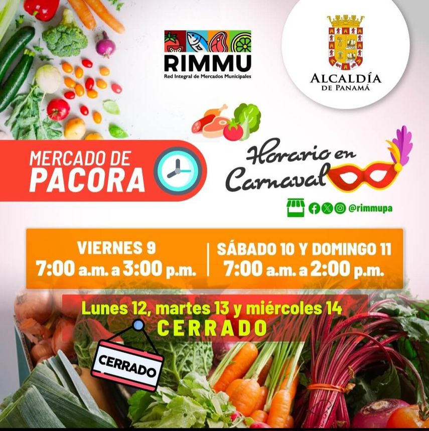 El Mercado Periférico de Pacora informa que su horario de 7 a.m. a 2 p.m. el sábado y el domingo, mientras que el lunes 12, martes 13 y miércoles 14 de febrero permanecerá cerrado.