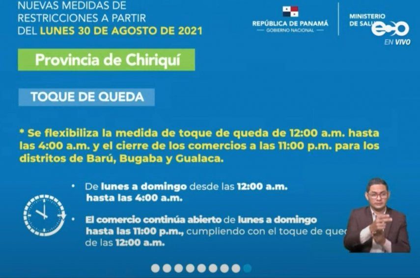 Mientras, en la provincia de Chiriquí en los distritos de Barú, Bugaba y Gualaca, el toque de queda también regirá desde las 12:00 a.m. hasta las 4:00 a.m. y el cierre de los comercios a las 11:00 p.m.