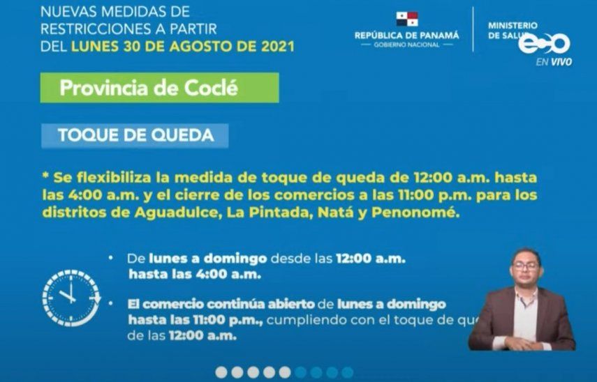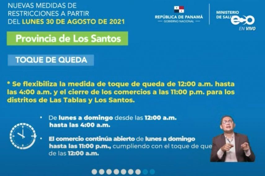 Paralelamente, el ministro Sucre señaló que, desde el próximo 30 de agosto, para los distritos de Las Tablas y Los Santos, en la provincia de Los Santos, se flexibiliza la medida de toque de queda de 12:00 a.m. hasta las 4:00 a.m. y el cierre de los comercios a las 11:00 p.m.