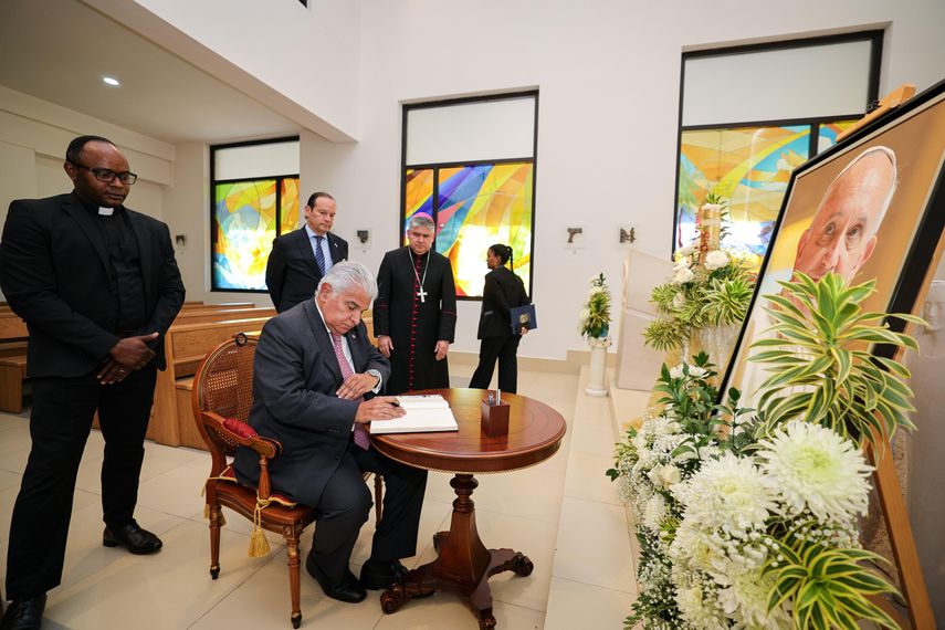 Luego, se trasladaron a la capilla de la Nunciatura, donde, en nombre del pueblo panameño, el presidente Mulino redactó un mensaje en el libro de condolencias.