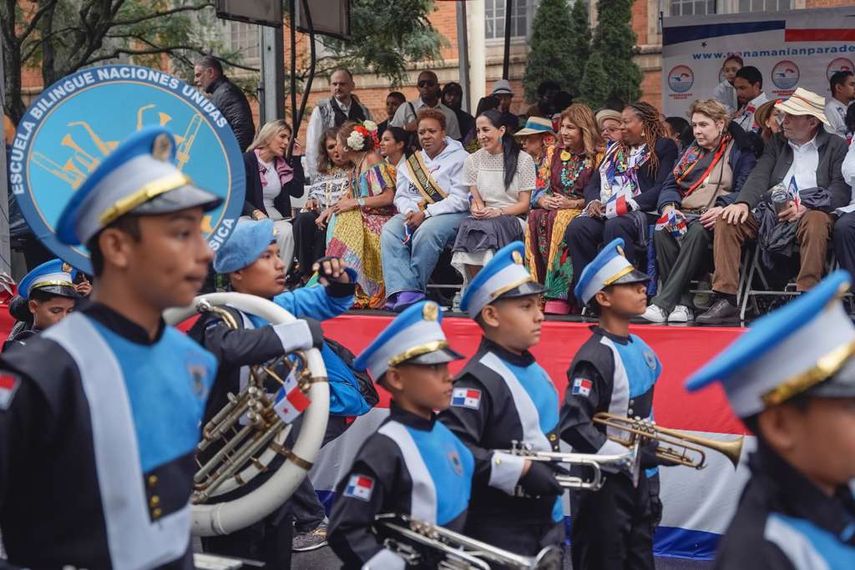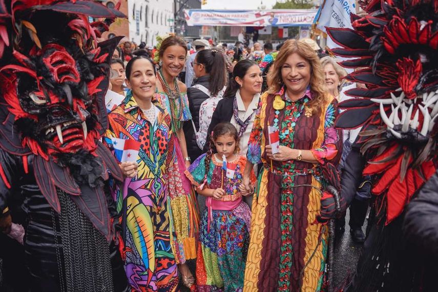 El desfile estuvo encabezado por Maricel de Mulino, primera dama de Panamá, y la ministra de Cultura, María Eugenia Herrera, quienes compartieron con orgullo el espíritu patriótico de la diáspora panameña en Nueva York.
