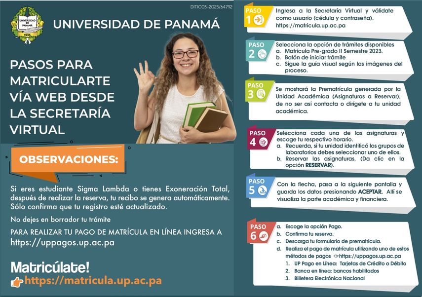 ¡Ojo! Presta atención a esta información para que no quedes por fuera. La Universidad de Panamá inicia el lunes 7 de agosto el proceso de matrícula para el segundo semestre de 2023.
