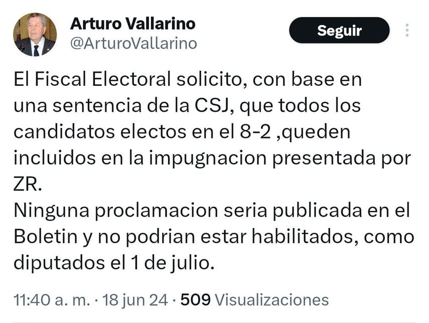 "El Fiscal Electoral solicitó, con base en una sentencia de la CSJ [Corte Suprema de Justicia], que todos los candidatos electos en el 8-2, queden incluidos en la impugnación presentada por ZR [Zulay Rodríguez]. Ninguna proclamación sería publicada en el Boletín y no podrían estar habilitados, como diputados, el 1 de julio", añadió en una segunda publicación.