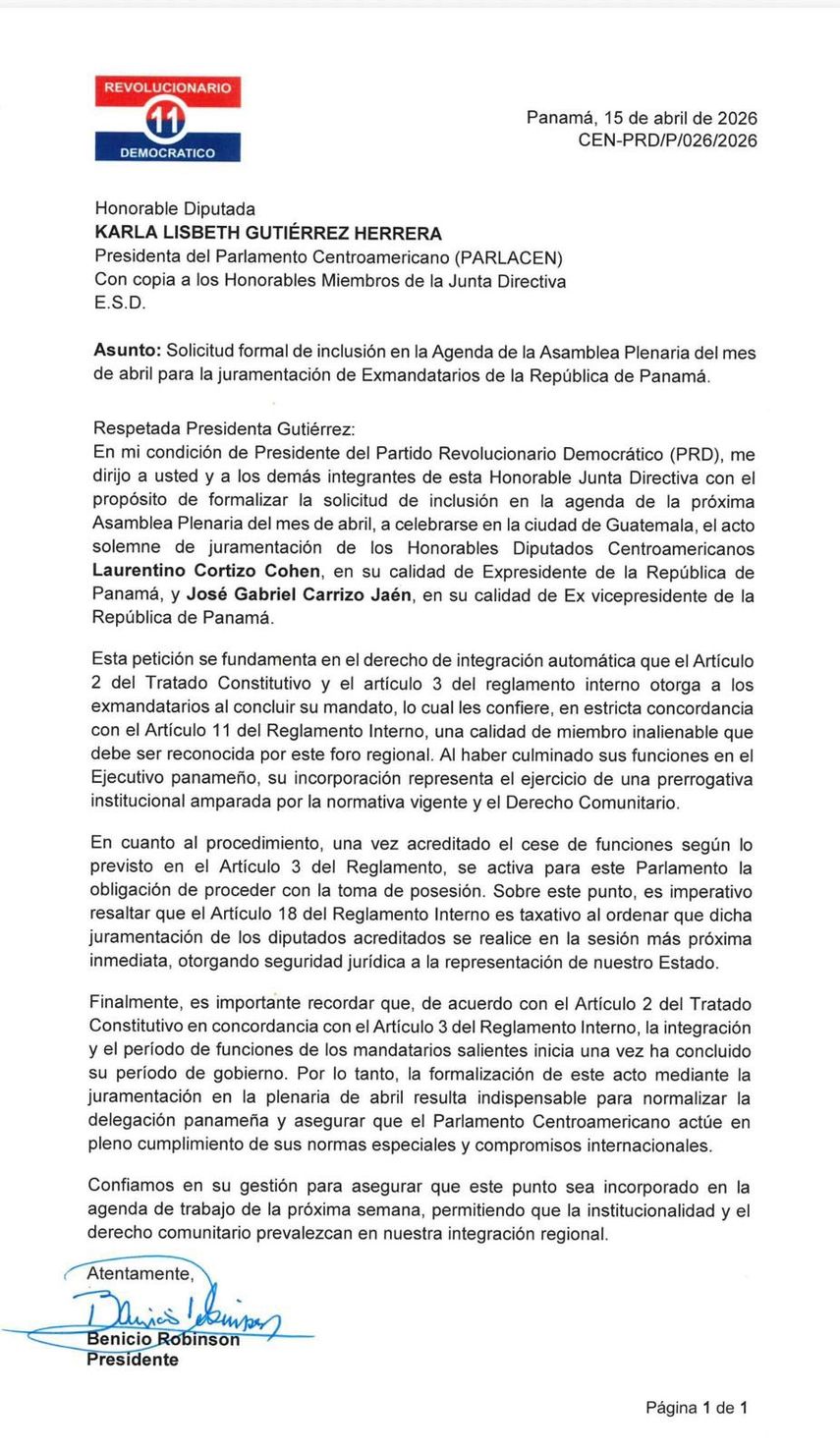 El partido Partido Revolucionario Democrático (PRD) solicitó formalmente la inclusión en la agenda del Parlamento Centroamericano (Parlacen) de la juramentación del expresidente Laurentino Nito Cortizo Cohen y del exvicepresidente José Gabriel Carrizo Jaén como diputados de ese organismo regional.
