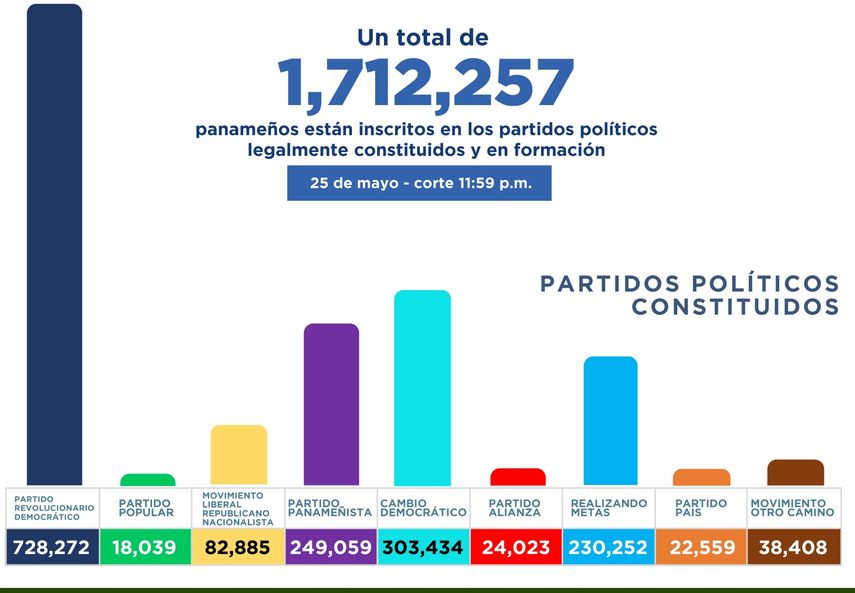 La cifra de personas inscritas en los partidos políticos en Panamá legalmente constituidos y en formación, La cifra de personas inscritas en los partidos políticos en Panamá legalmente constituidos y en formación asciende a un total de1,712,257 en los distintos partidos de acuerdo con cifras de la Dirección Nacional de Organización Electoral (DNOE), según la información recopilada hasta las 11:59 p.m. del jueves 25 de mayo.