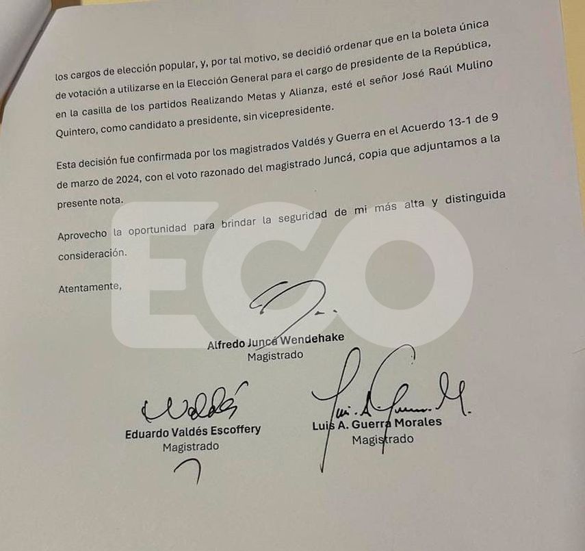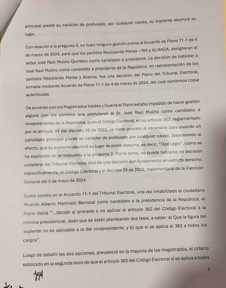 La decisión del pleno, aunque no fue unánime, se basó en el artículo 362 del Código Electoral, el cual establece que cuando un candidato principal pierde su carácter de postulado, el suplente asumirá su lugar. En su momento el magistrado Alfredo Juncá emitió un voto razonado, porque a su juicio, Mulino no fue a primarias, además que la nómina debió ser completa y la figura de suplente no es aplicable a vicepresidente
